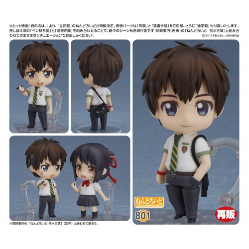 He comes with two face plates including a gentle smile as well as a face with writing on his cheek. His school bag is also included, and he also comes with an interchangeable hand holding a pen which can be used with the alternate face plate to recreate the scene from the film! Be sure to display him together with Nendoroid Mitsuha Miyamizu who will be available for preorder at the same time!